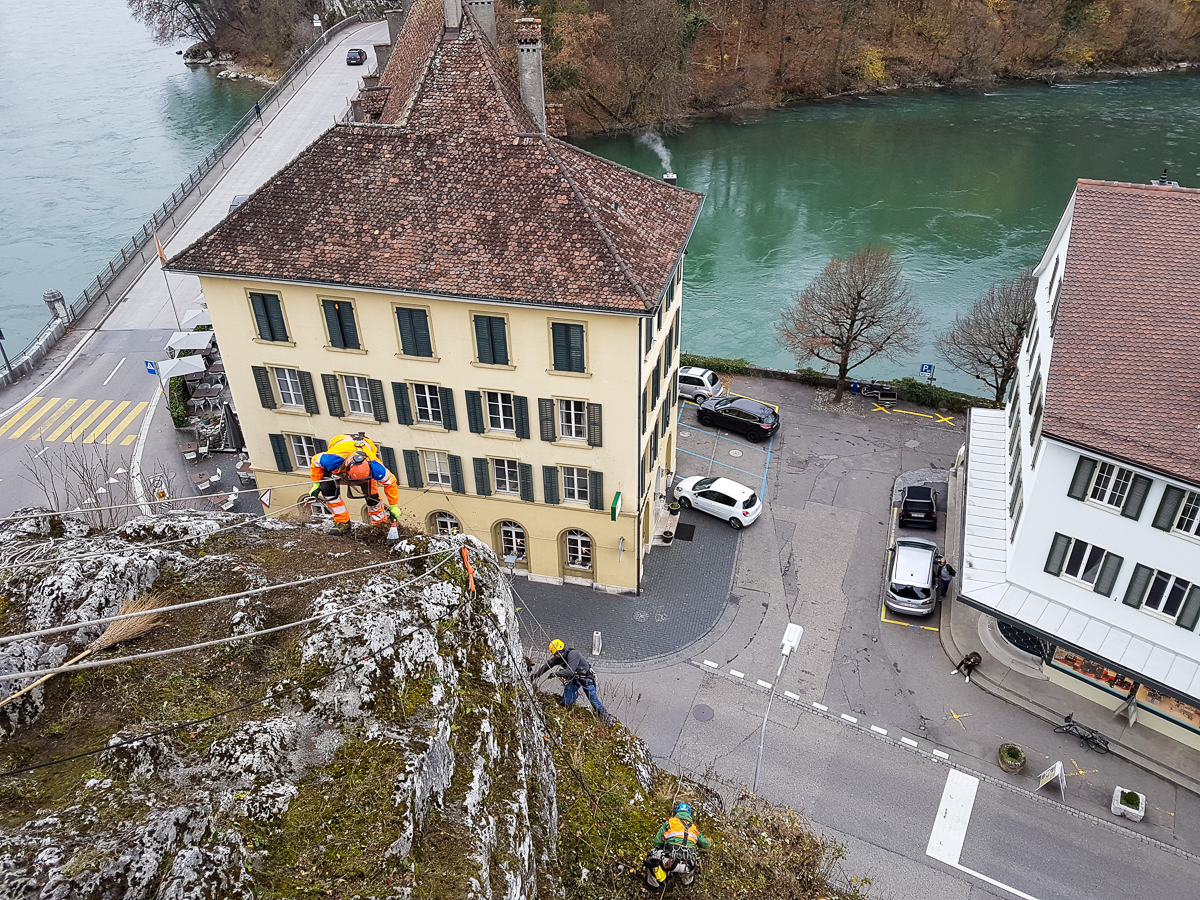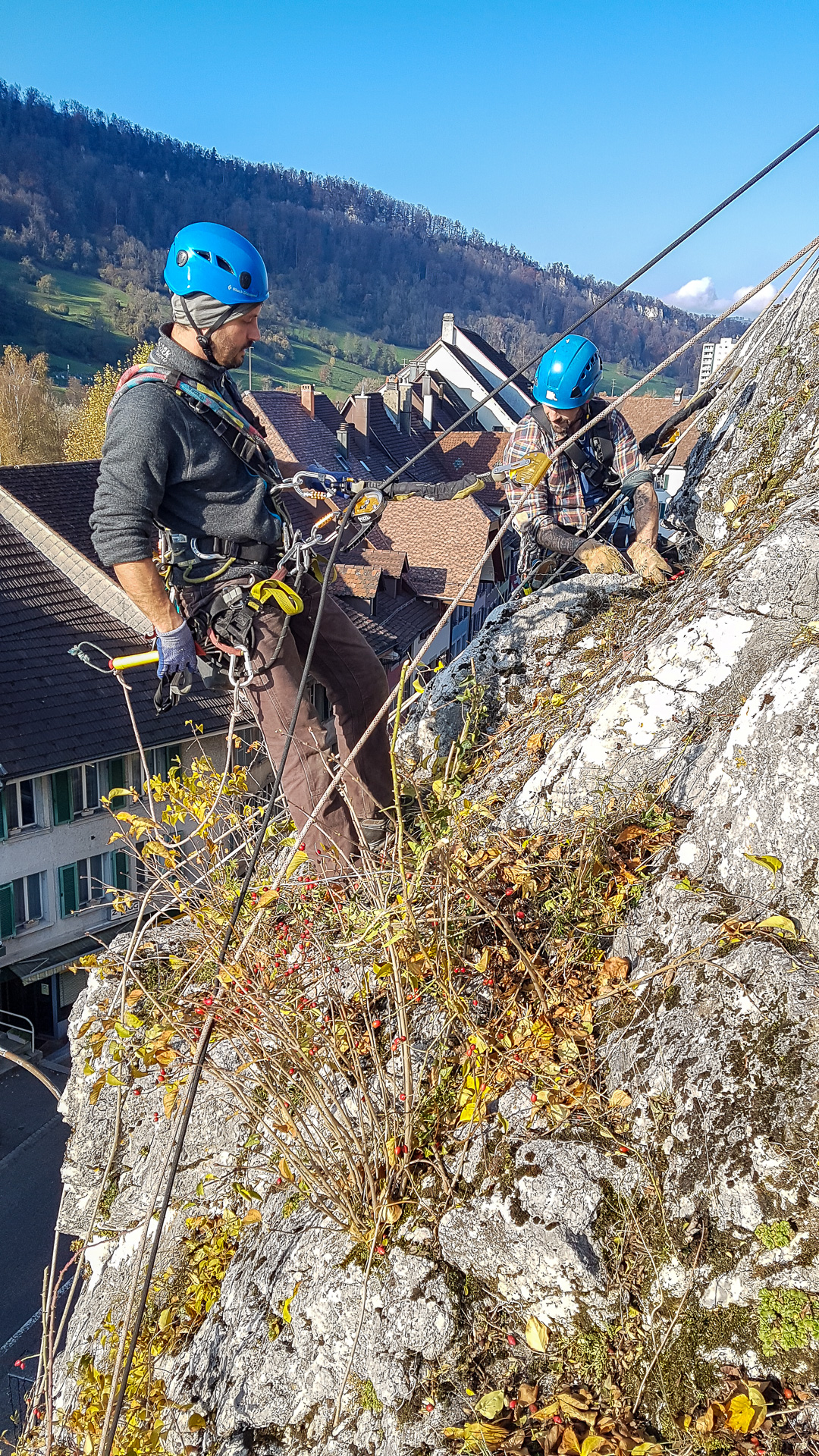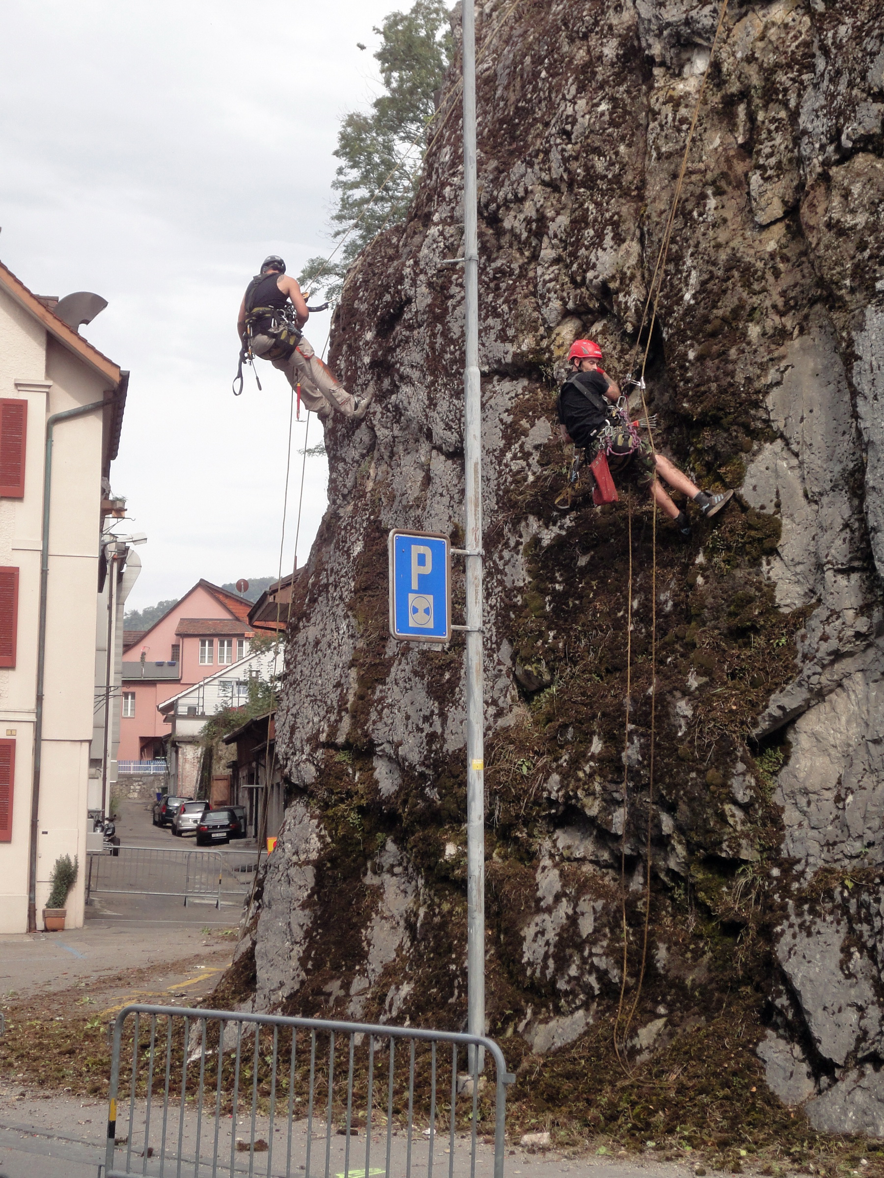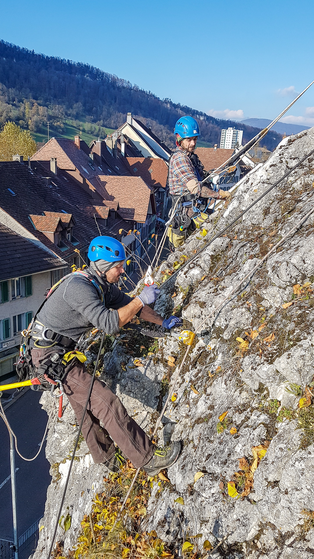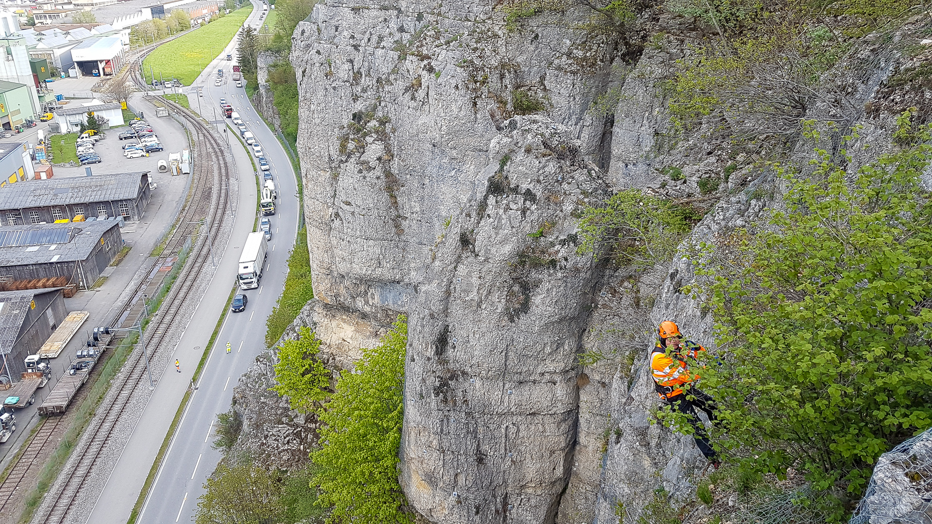 Felsräumungen können nötig werden, wenn sich oberhalb von Strassen lose Felspartien befinden und diese eine Gefährdung für den Verkehr darstellen. Dazu werden Strassen und Wege gesperrt und unsere Seilarbeiter räumen am hängenden Seil lockeres Gestein aus den Felswänden.
