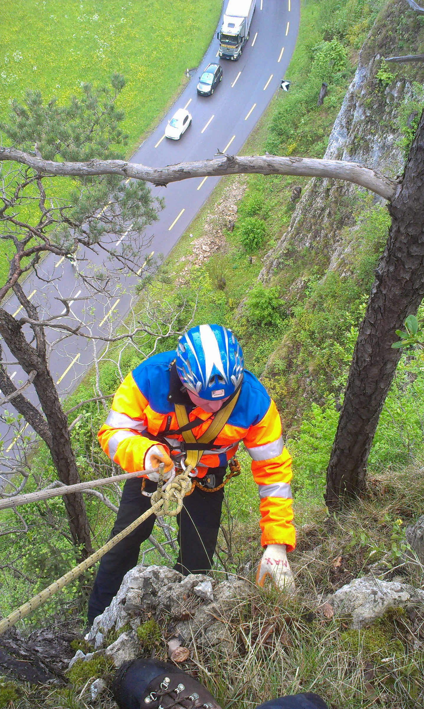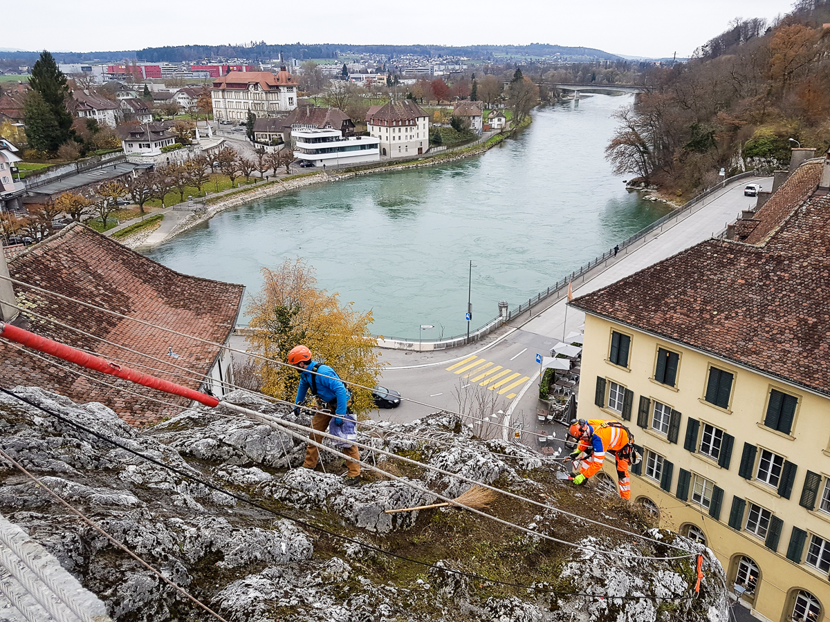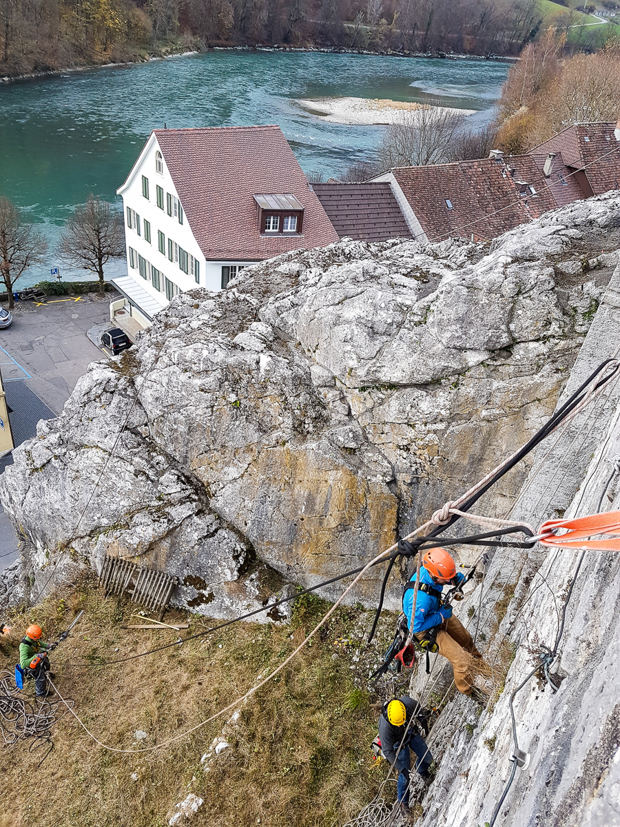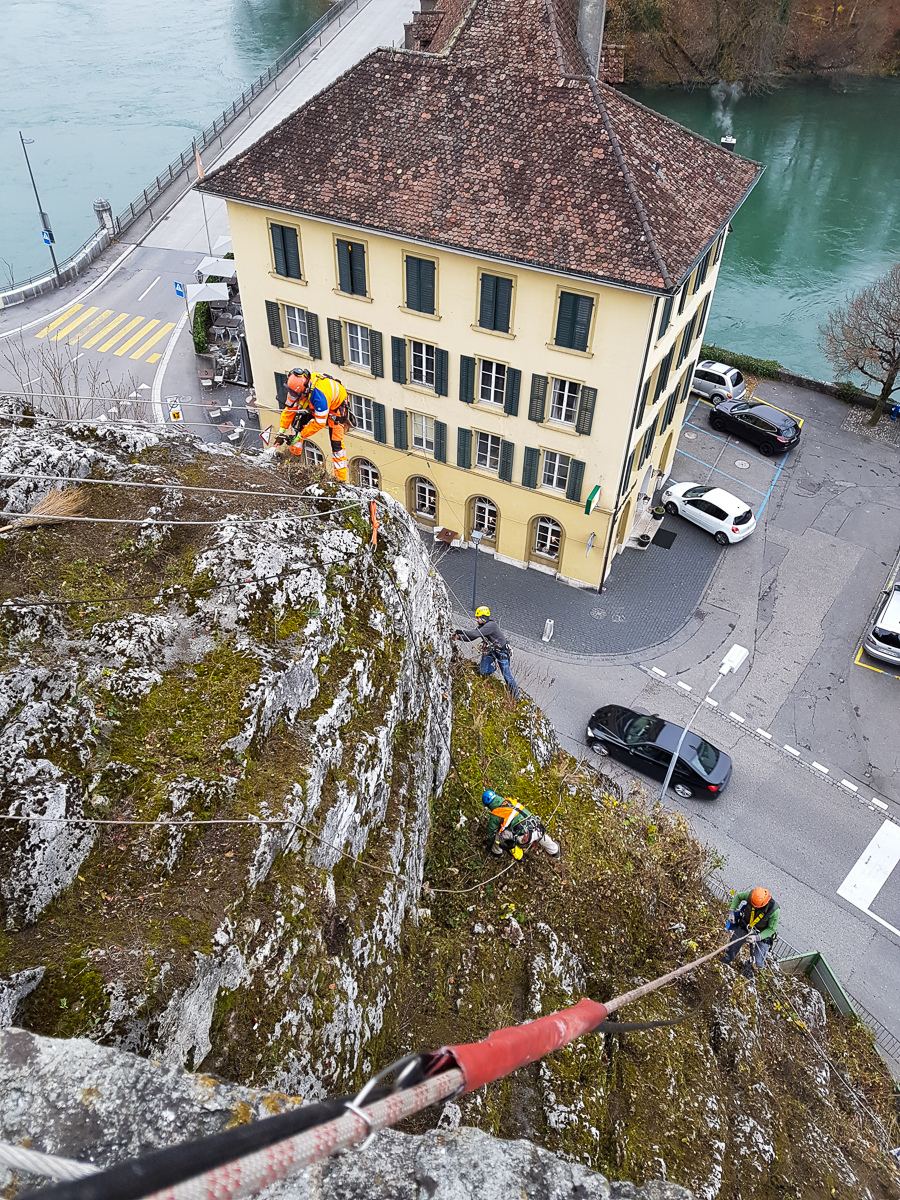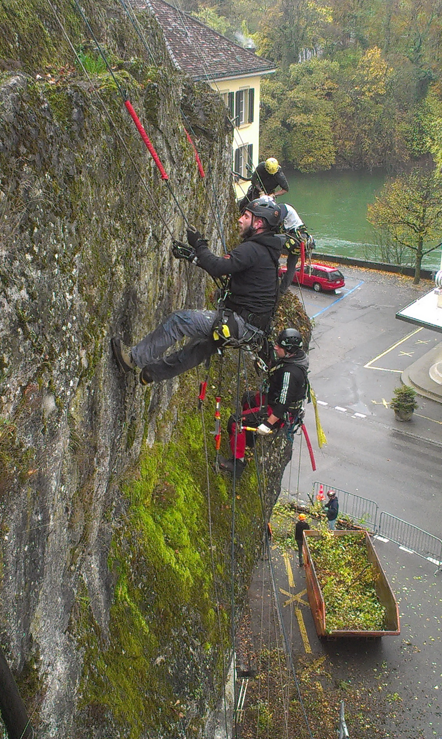 Felsräumungen können nötig werden, wenn sich oberhalb von Strassen lose Felspartien befinden und diese eine Gefährdung für den Verkehr darstellen. Dazu werden Strassen und Wege gesperrt und unsere Seilarbeiter räumen am hängenden Seil lockeres Gestein aus den Felswänden.