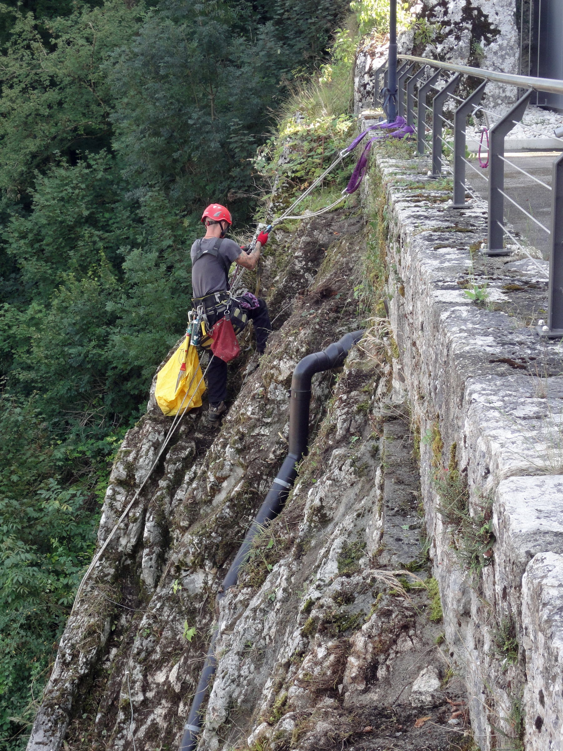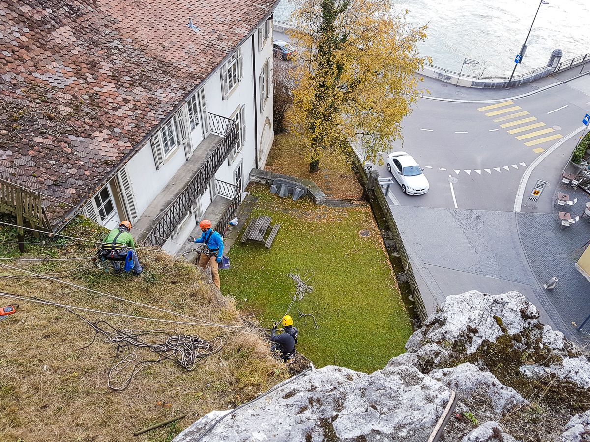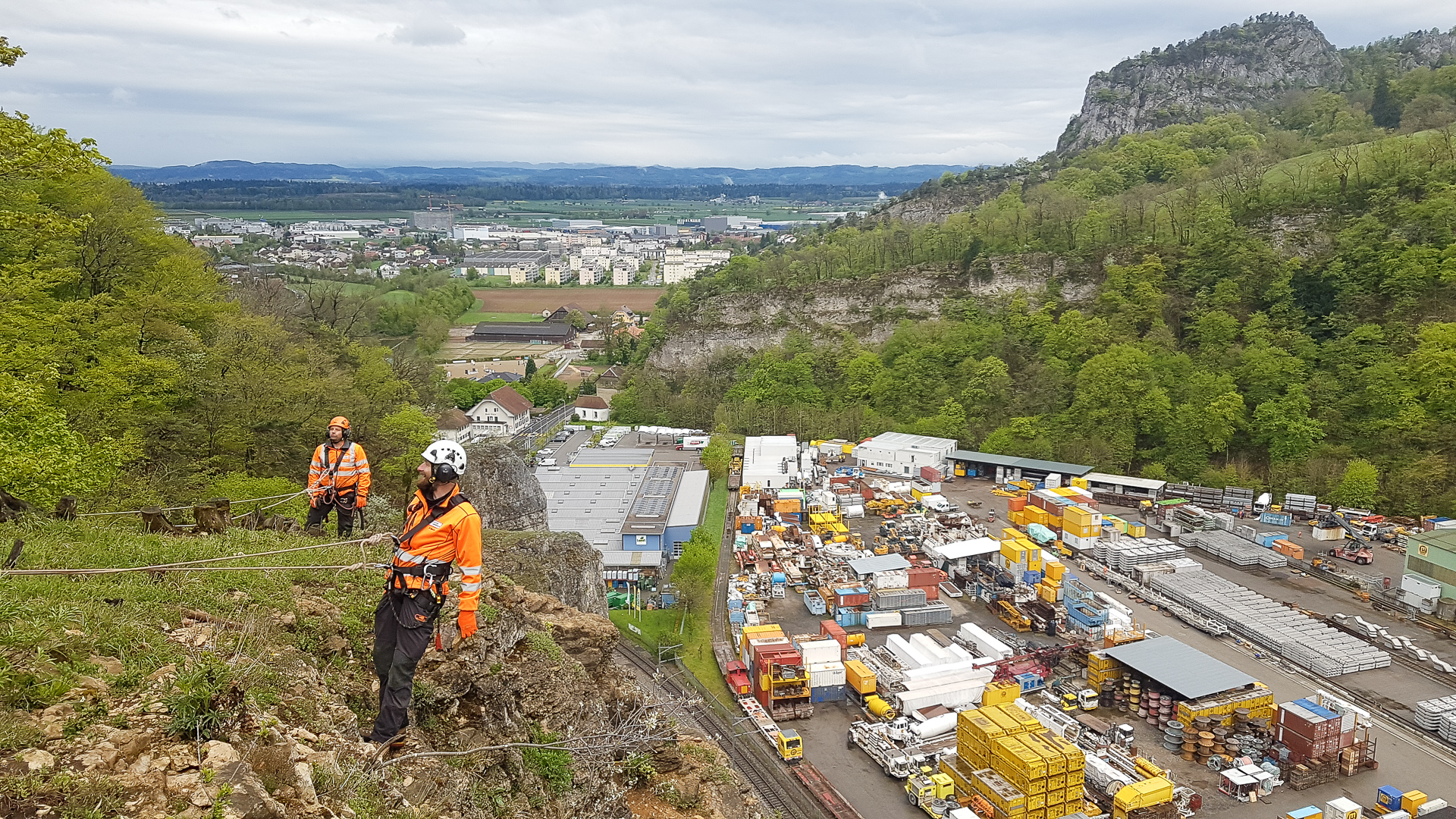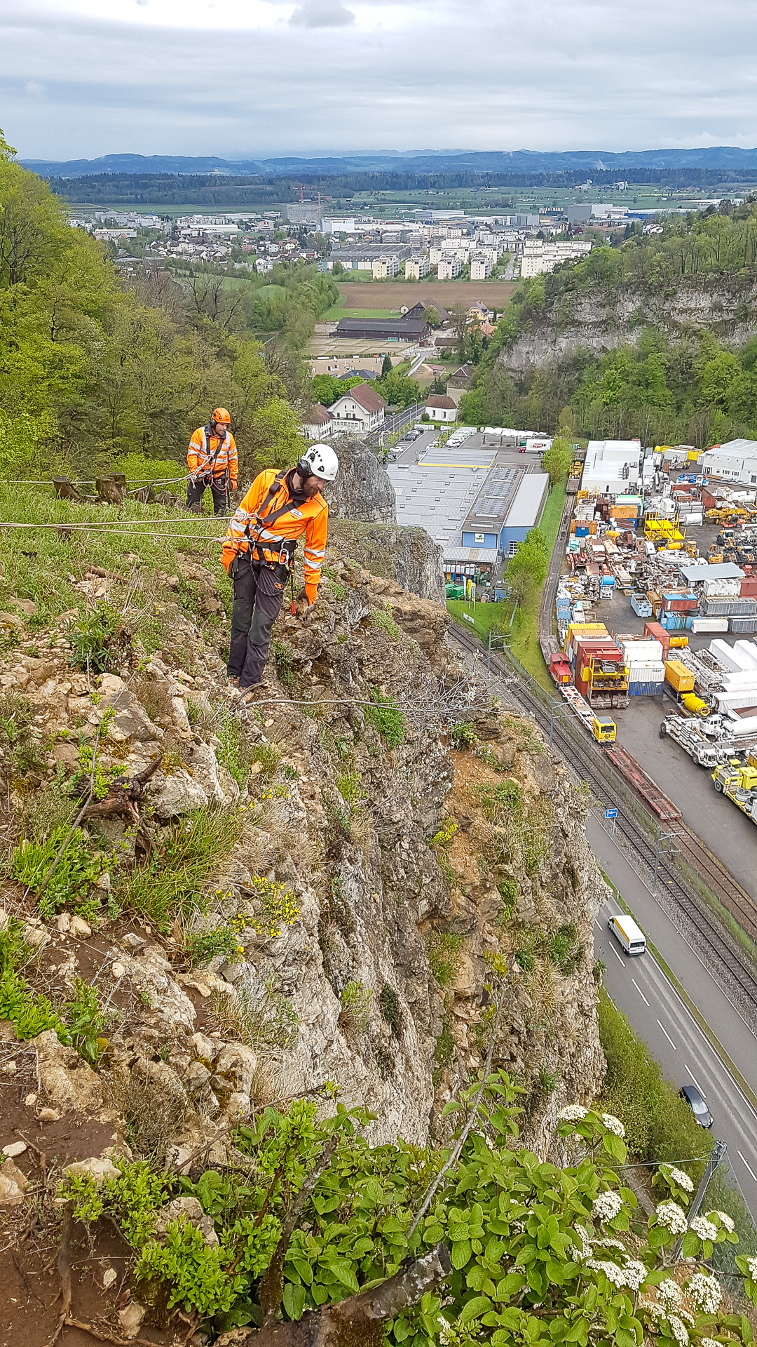 Felsräumungen können nötig werden, wenn sich oberhalb von Strassen lose Felspartien befinden und diese eine Gefährdung für den Verkehr darstellen. Dazu werden Strassen und Wege gesperrt und unsere Seilarbeiter räumen am hängenden Seil lockeres Gestein aus den Felswänden.
