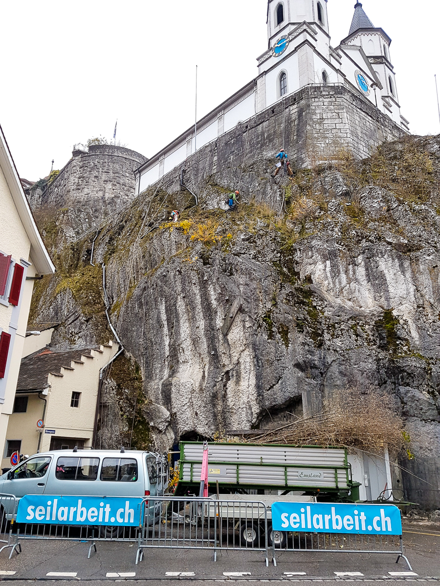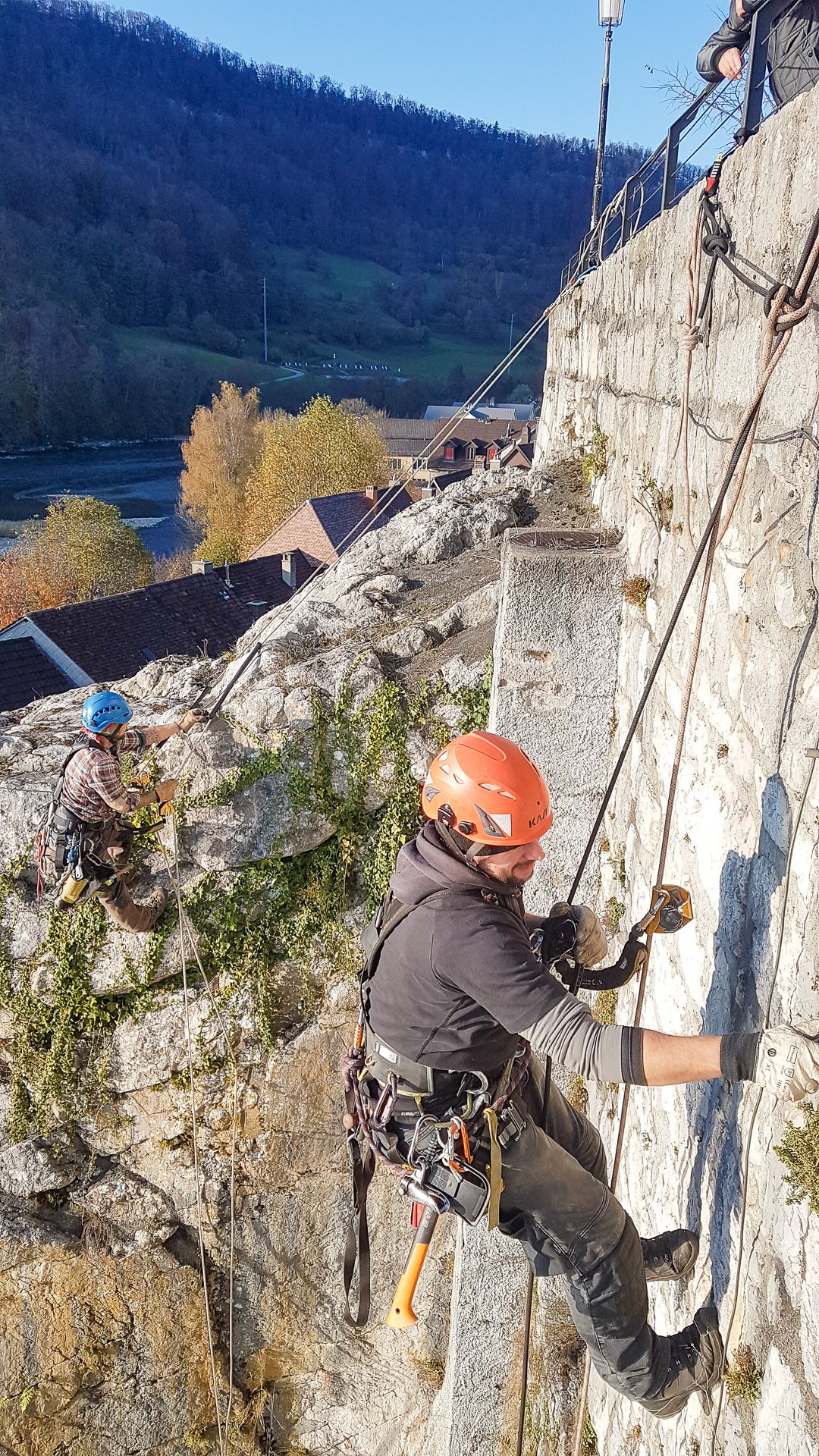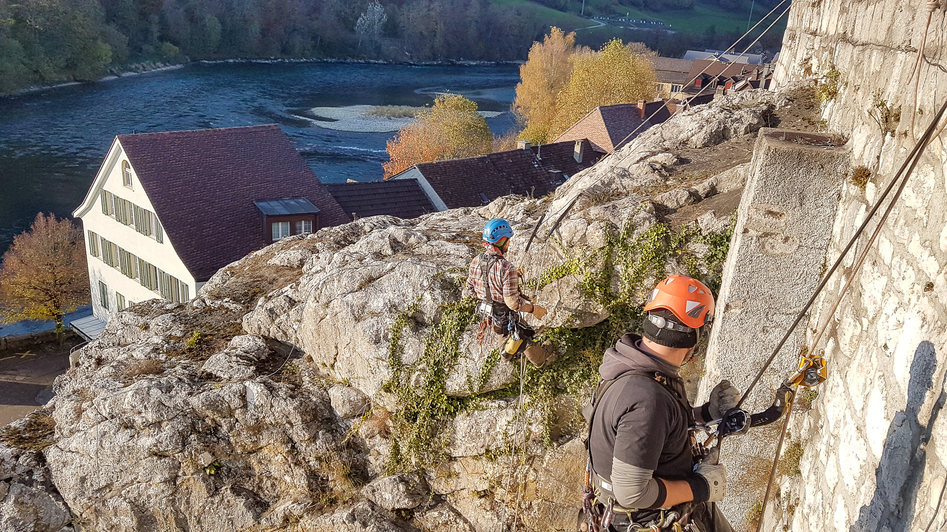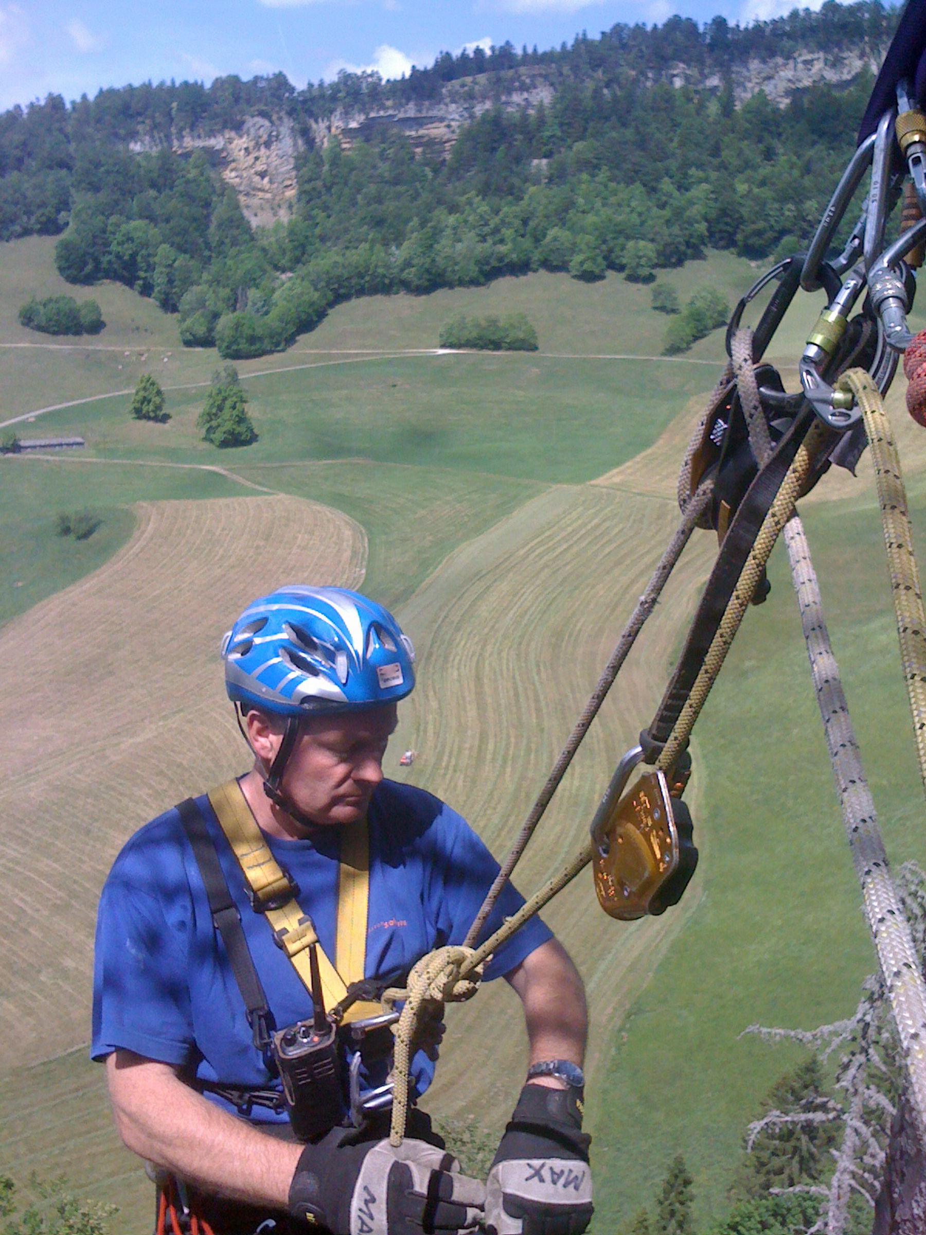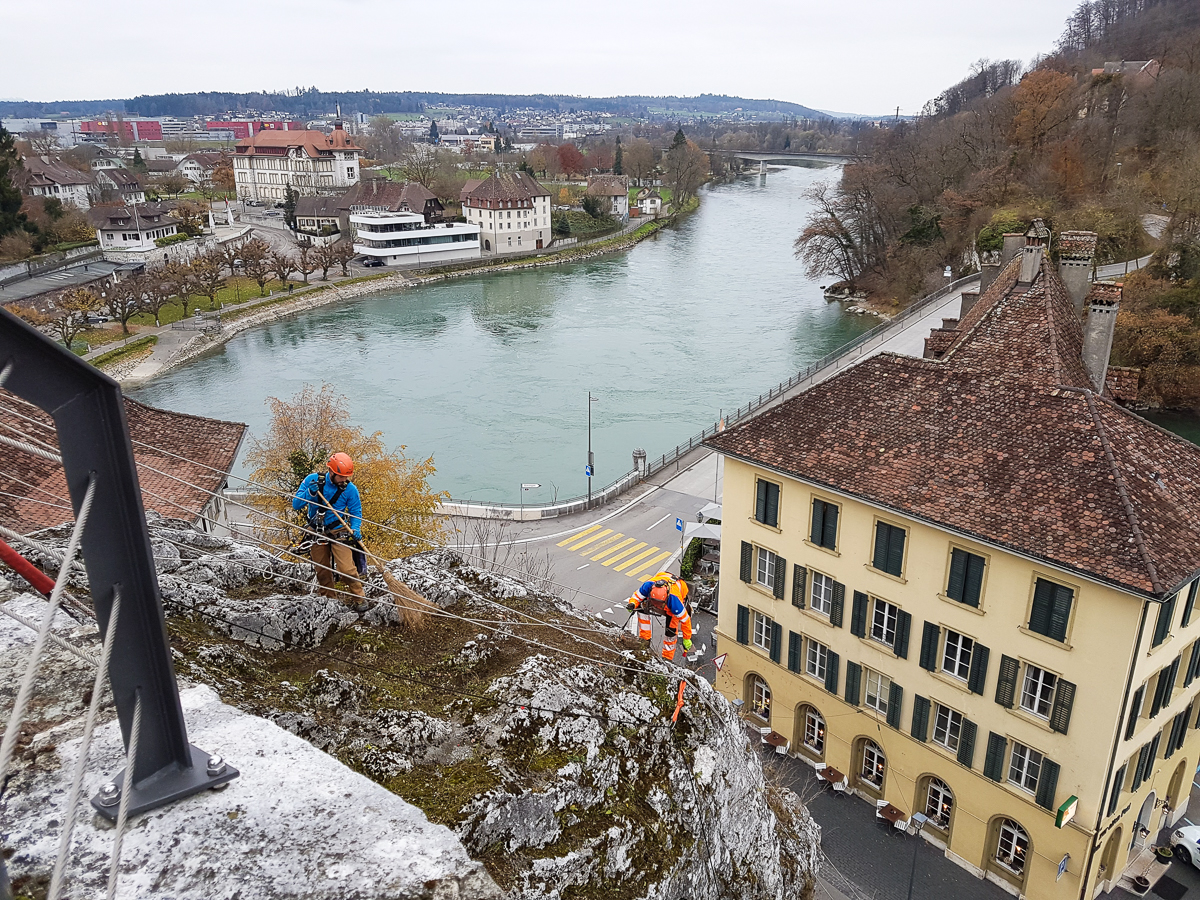 Felsräumungen können nötig werden, wenn sich oberhalb von Strassen lose Felspartien befinden und diese eine Gefährdung für den Verkehr darstellen. Dazu werden Strassen und Wege gesperrt und unsere Seilarbeiter räumen am hängenden Seil lockeres Gestein aus den Felswänden.
